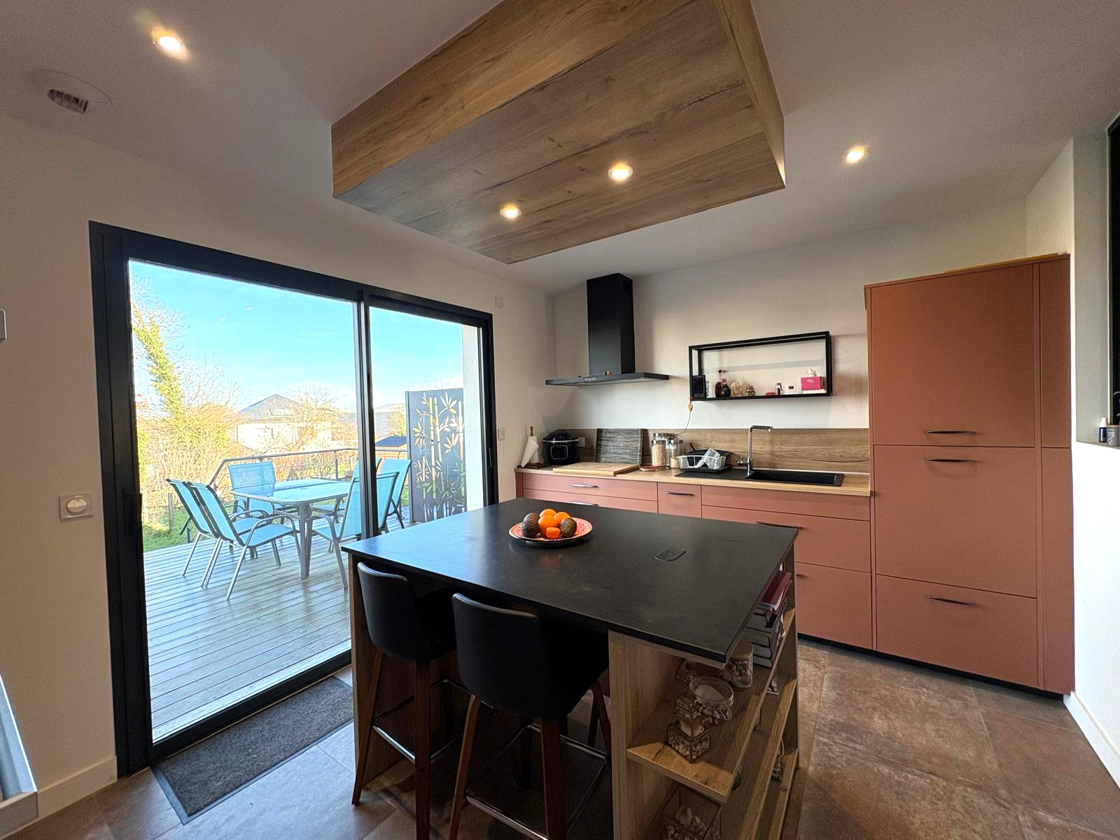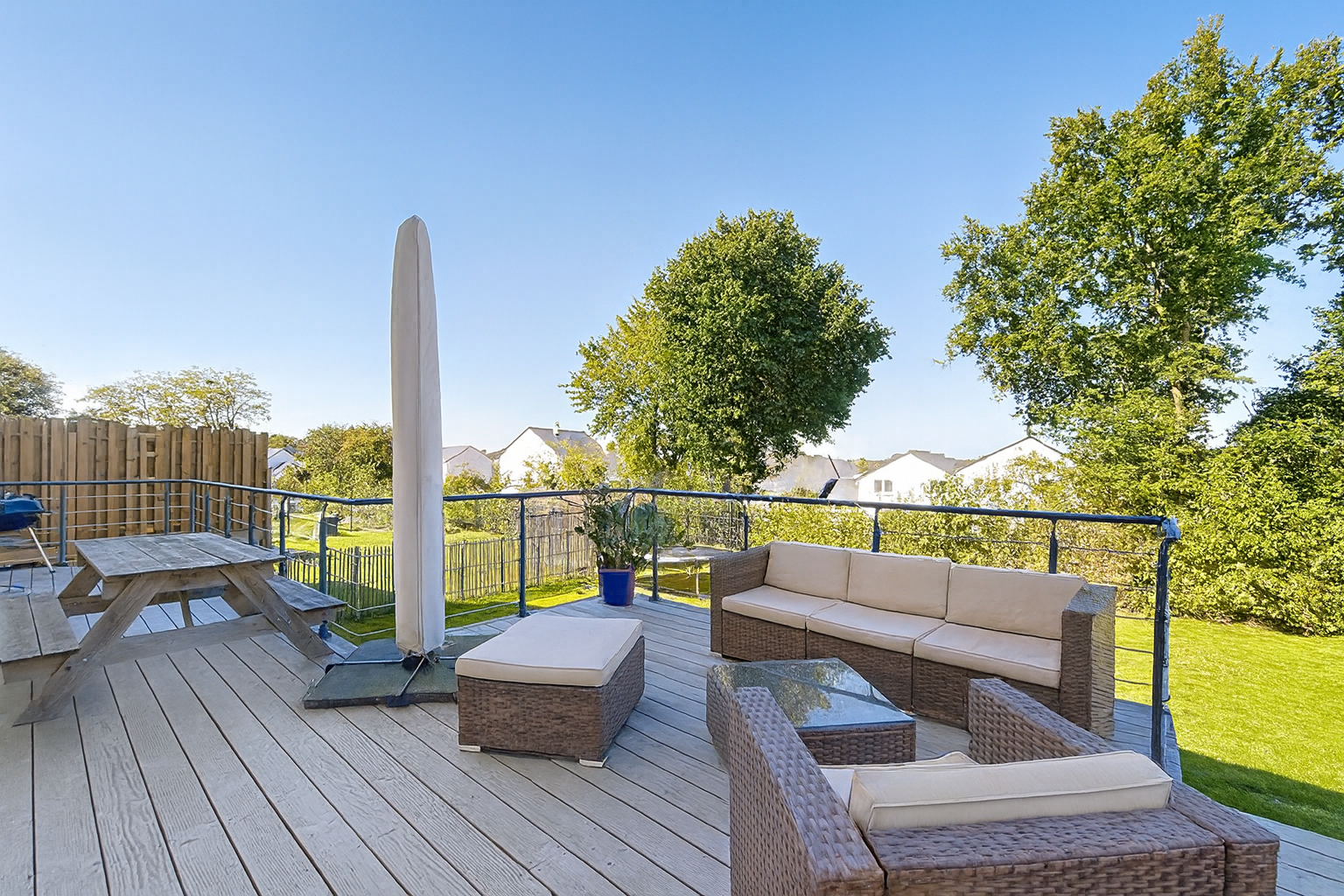 La grande terrasse, longeant toute la façade arrière de la maison, permet de profiter pleinement de l’extérieur et donne sur un jardin en contrebas, parfaitement clôturé.