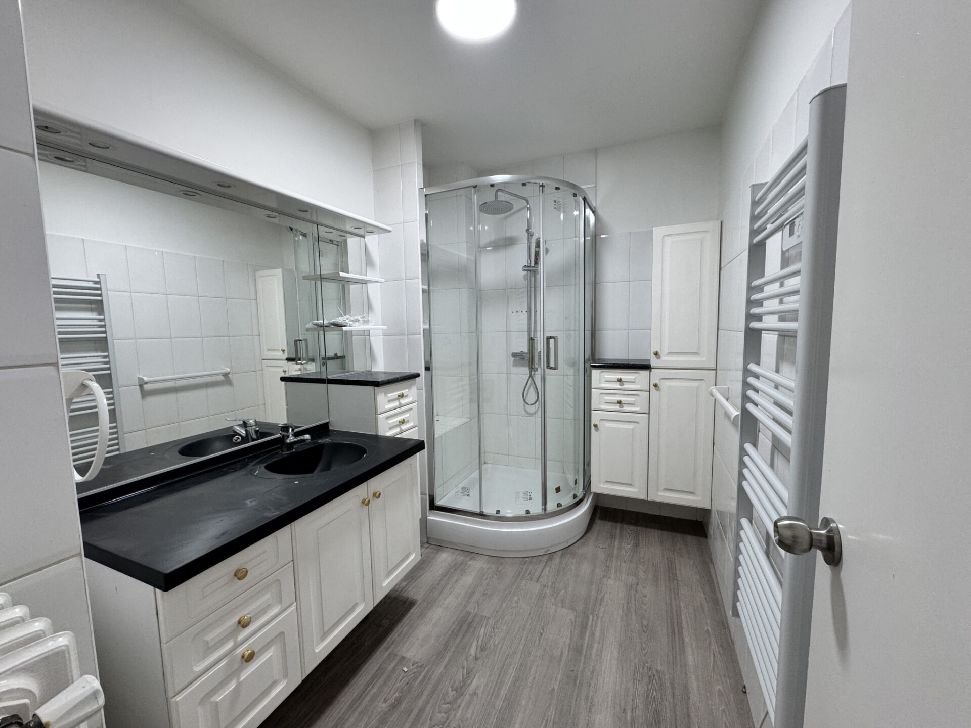 La cuisine aménagée et entièrement équipée est complétée par une buanderie attenante, offrant un espace de rangement fonctionnel. Côté nuit, deux chambres avec balcon garantissent confort et luminosité, accompagnées d’un espace dressing, d’une salle d’eau moderne et d’un WC séparé.