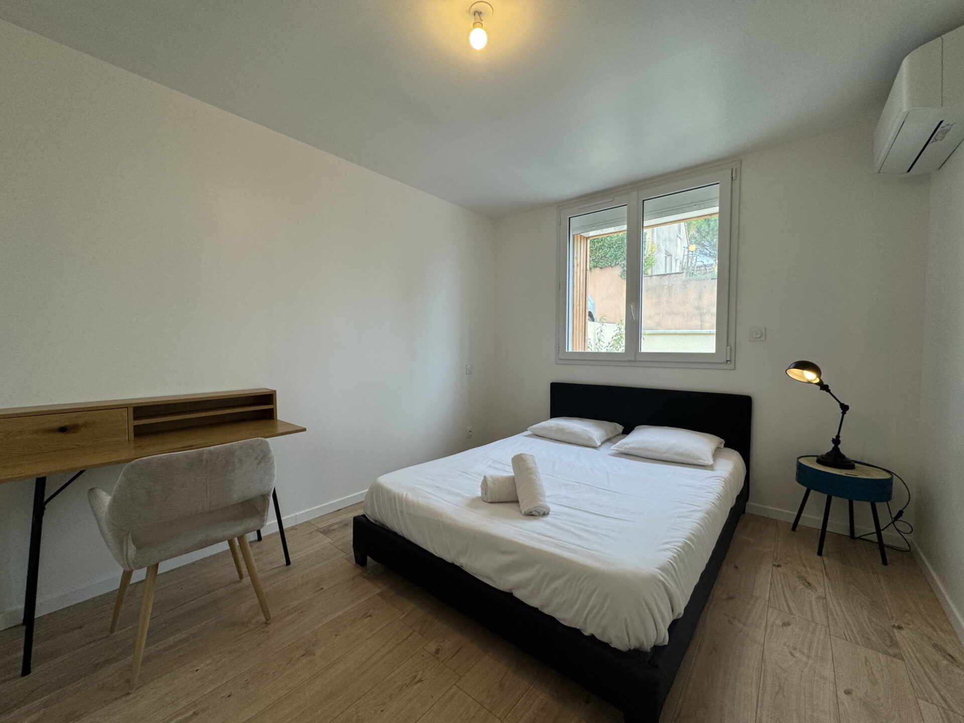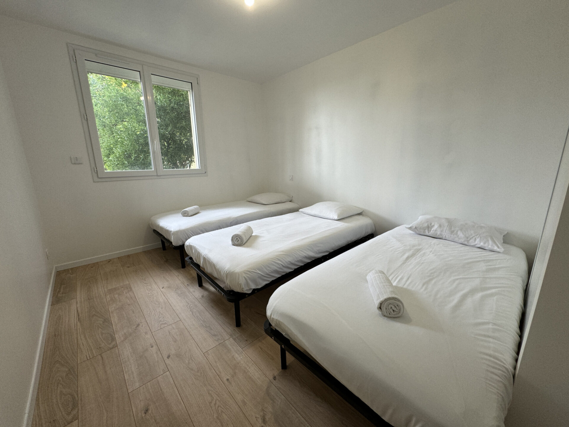 Deux chambres confortables : • Une chambre avec lit double • Une chambre avec trois lits simples (idéale enfants ou bureau/dressing)