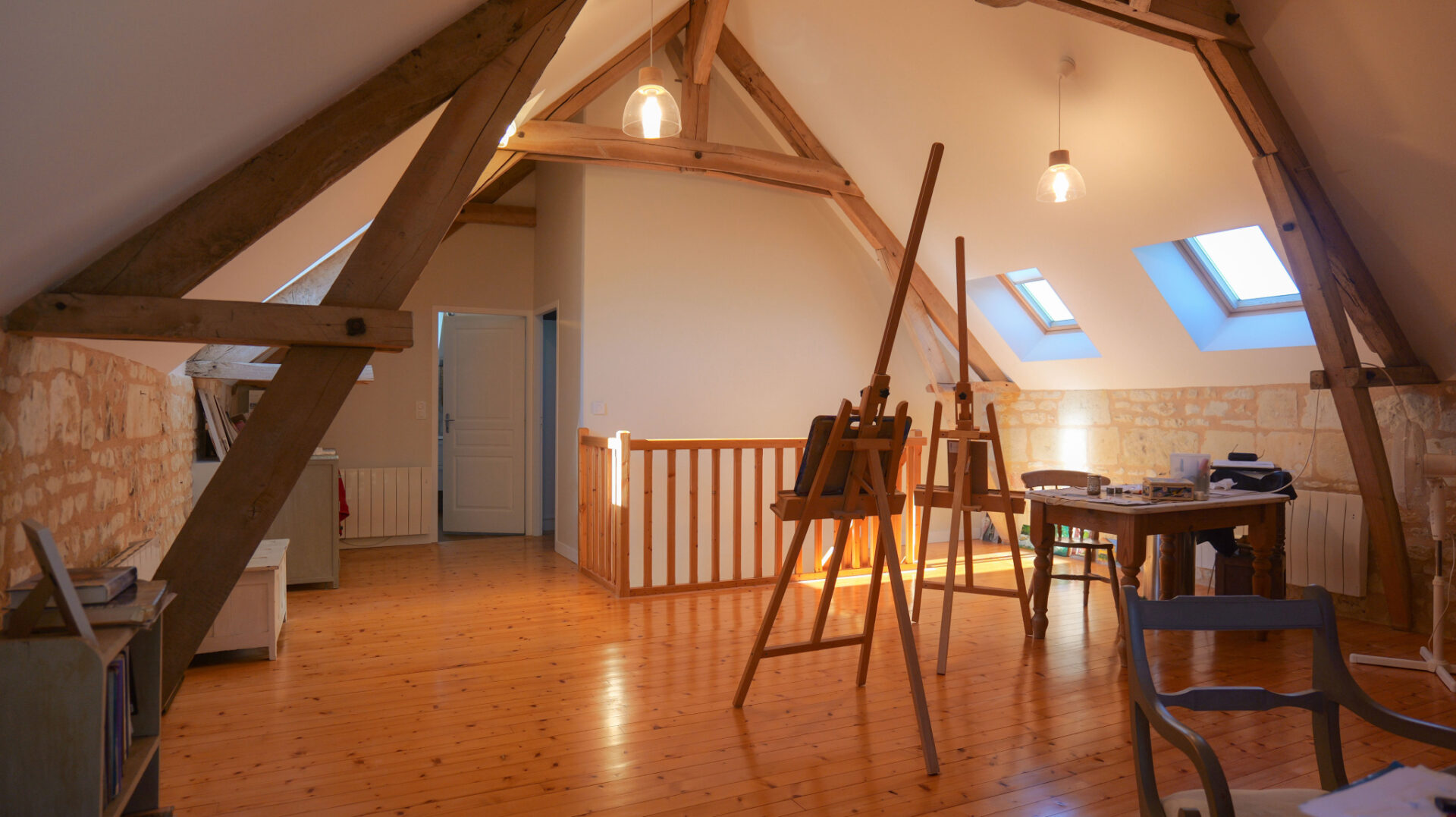 Dans les combles aménagés Ancien grenier transformé en un bel espace de 47,1 m2 habitables (64,1 m2 au sol), comprenant une vaste pièce principale avec point d’eau, une chambre lumineuse et une salle d’eau moderne.