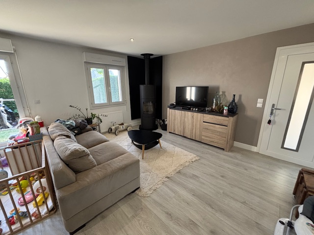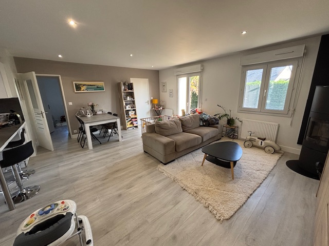 Vivre de plain‑pied : salon‑séjour lumineux avec poêle à bois, cuisine ouverte aménagée/équipée, trois vraies chambres, salle d’eau moderne, buanderie attenante.